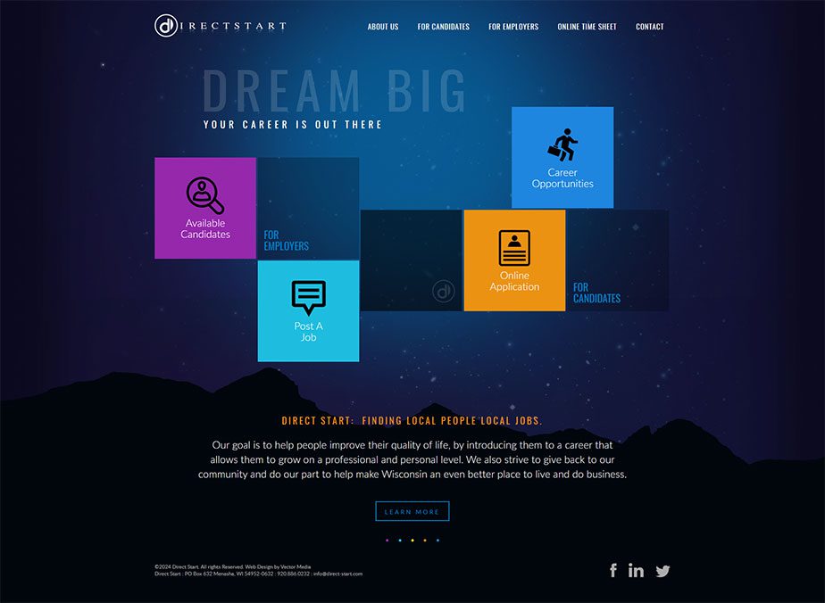 Direct Start is a Menasha-based staffing company that has been connecting businesses with hard working employees for nearly two decades. They were in need of a website that showcased their organization and its services as well as provide resources for employers and candidates alike. Here’s what we built: