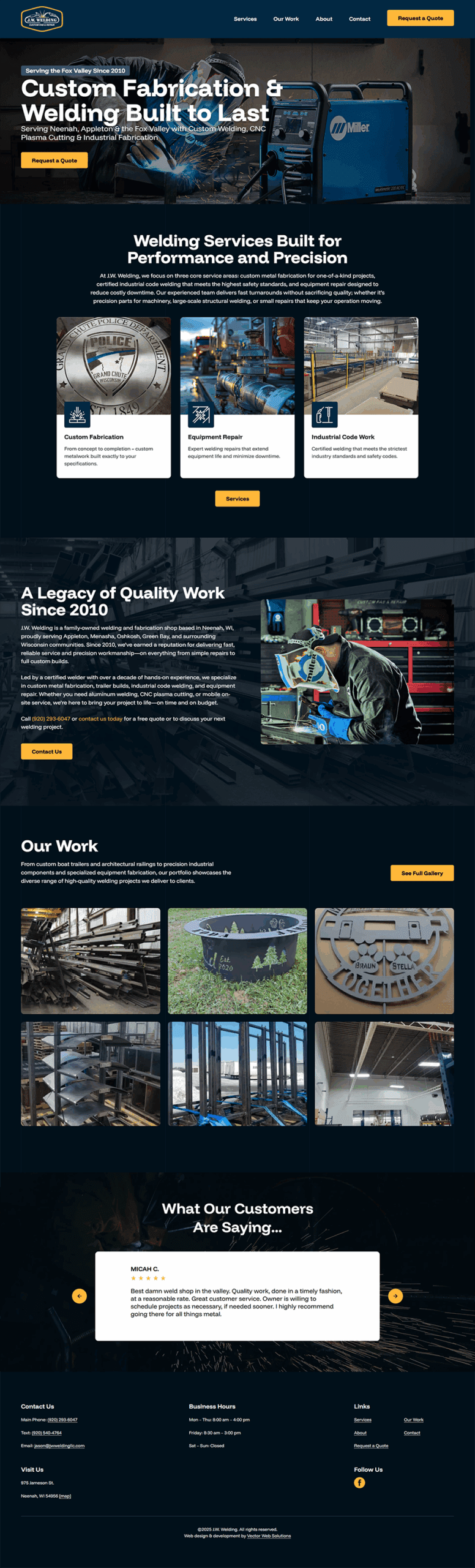 JW Welding is a Fox Valley based metal fabrication and welding company known for its custom solutions and dependable craftsmanship. They came to Vector Web Solutions after spending years with a subscription-based web vendor that charged heavily but delivered almost no value. Their old site lacked clarity, didn’t accurately showcase their capabilities, and gave them little control over updates. We partnered with their team to build a clean, functional platform that highlights their capabilities and supports their growth.